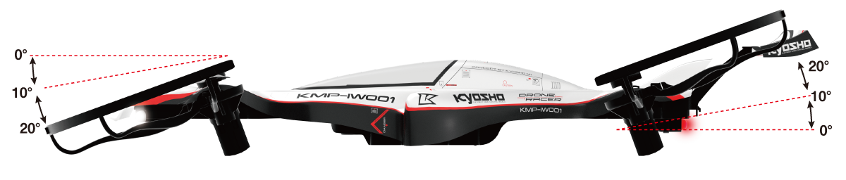 H-type chassis with split upper and lower sections and left-right propellers connected on one propeller arm allow the propeller unit angle to be changed between: 0°, 10°, 20°. Use more stability (0°/ max speed : 30km/h) or more speed (20°/ max speed : 34.5km/h) as a racing weapon.