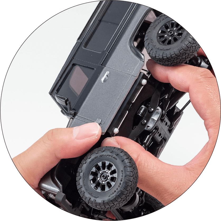ミニッツ史上最大の切れ角を実現し、適切なアッカーマン設定をしたことで最小回転半径を実現。通常走行だけでなく、本格ロッククローリング走行にも対応。